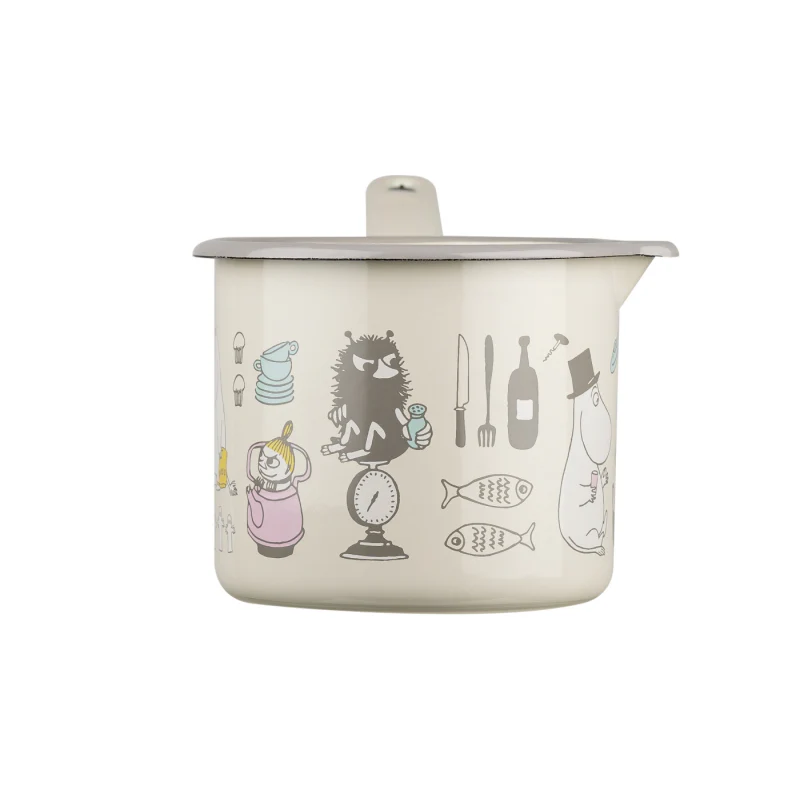 White saucepan from Muurla featuring different Moomin characters. The saucepan can be used on all types of stoves. Muurla's enamel consists of a carbon steel core that carries a double coating of enamel. The products are durable and lightweight. Due to these features, the items can also be used outdoors in addition to the traditional settings. Muurla's enamel is handmade and therefore the appearance may vary slightly. Capacity 1,3 L. Dishwasher safe. Do not place in the microwave.