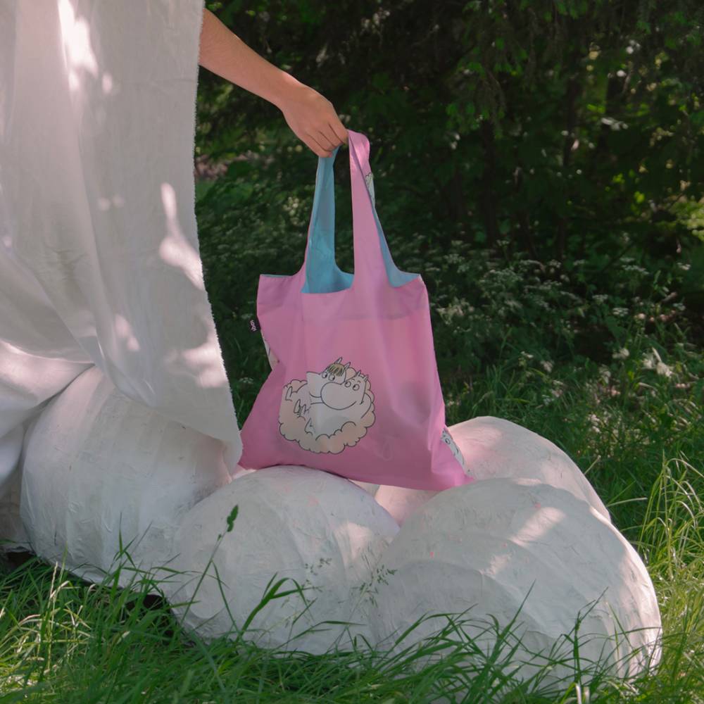 This pink recycled bag features an illustration of Moomintroll and Snorkmaiden. Perfect for grocery shopping, its lightweight yet incredibly strong material can hold up to 44 lb. The bag is water-resistant, produced using waterless printing, and recyclable. Weight: 1.98 oz. Dimensions: 19.7" × 16.5" with a zip pocket size of 4.7" × 4.7". Handle length: 10.6". Made from 100% recycled taffeta. Certified by GREEN CIRCLE® and STANDARD 100 by OEKO-TEX®.