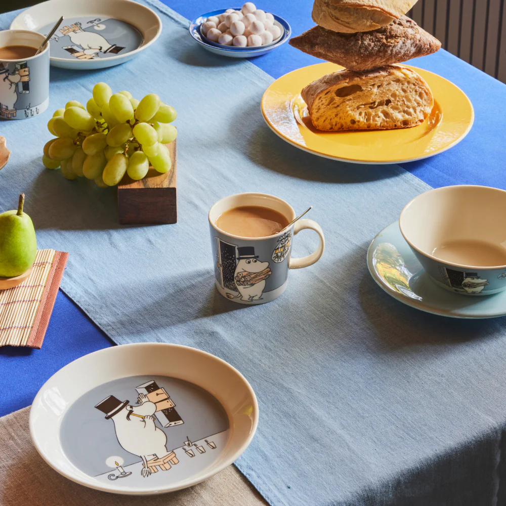 The illustrations are based on Tove Jansson’s comic Moomin Winter from 1959 and are arranged on a charmingly subtle grey background colour with muted yellow in the details. Material: Vitro-porcelain. Microwave, oven & dishwasher safe. Made in Thailand. Size: 7.5 inches.