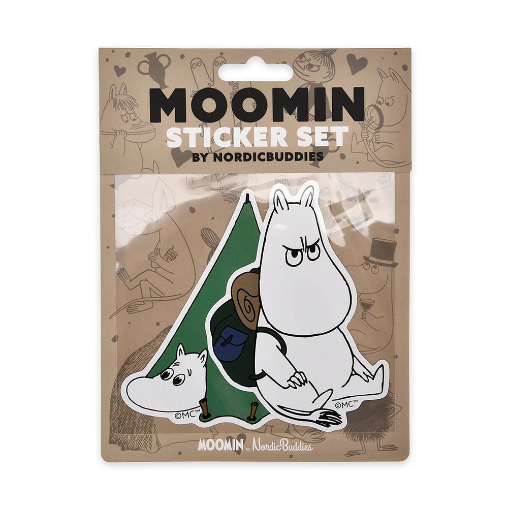 Moomintroll Camping XL Stickers 2-pack by Nordicbuddies. Packaging size 5.9" x 7.9" / Sticker sizes 5.5"-6.3". Material 100% paper. Made in China. © Moomin Characters™.