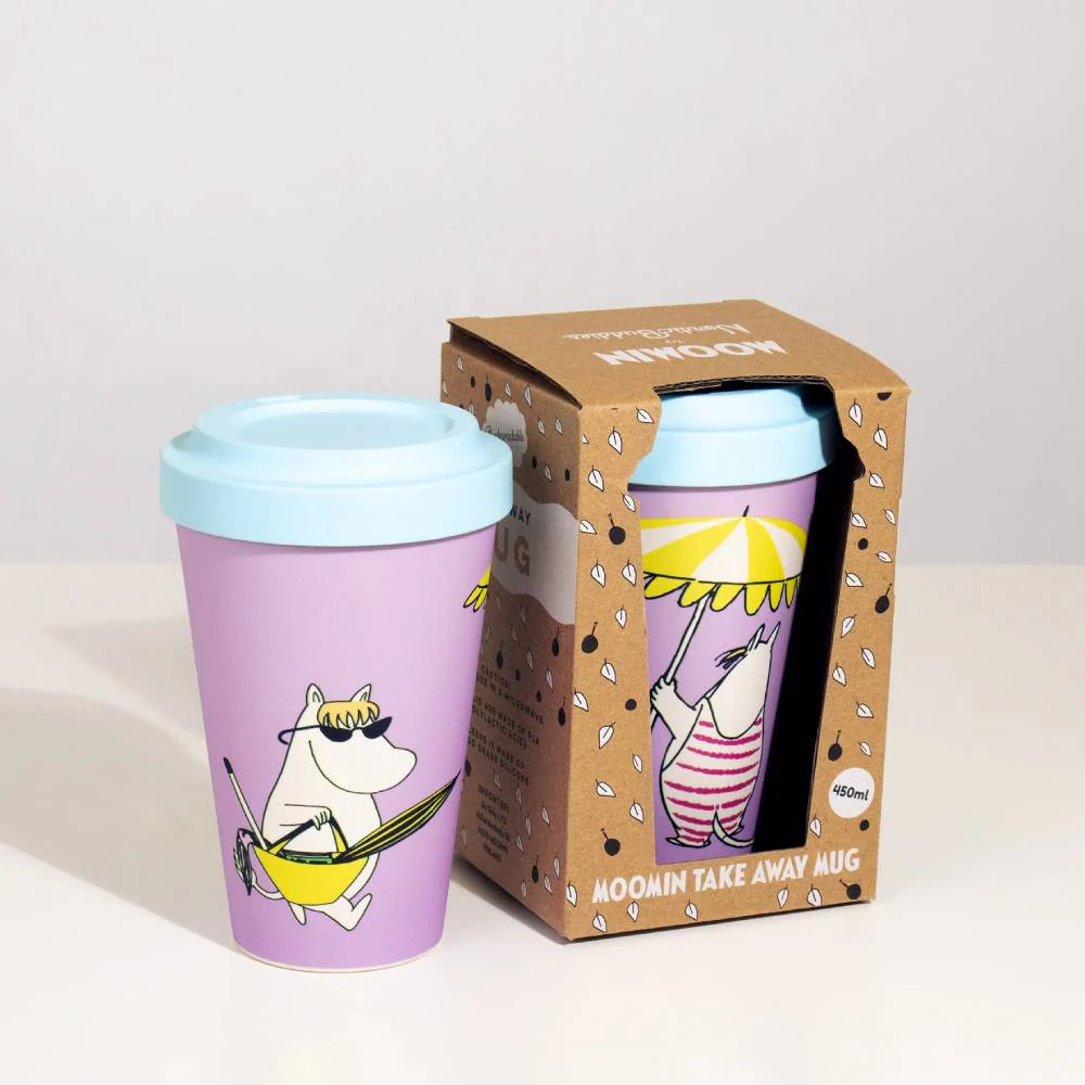 Convenient and fun lilac takeaway mug with an illustration of Snorkmaiden at the beach. This mug is made of PLA (polylactide), which is a completely biodegradable and renewable material. It looks like plastic, but it has no fossil-based plastic at all.